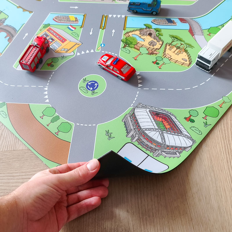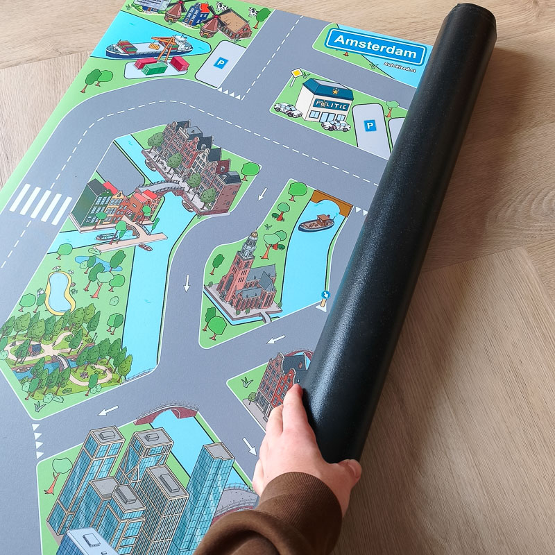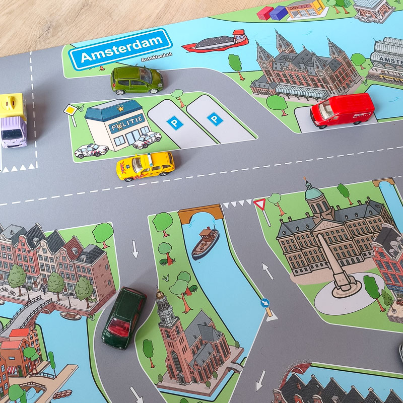 Speciaal door ons ontworpen; het autokleed van Amsterdam. Gebaseerd op onze hoofdstad met heel veel herkenningspunten op één speelgoedautokleed. Van de Jordaan tot aan de Westerkerk, van het centrale station tot aan de Zuid-as. Uiteraard inclusief de brandweer, het ziekenhuis en het politiebureau. Perfect voor kinderen.